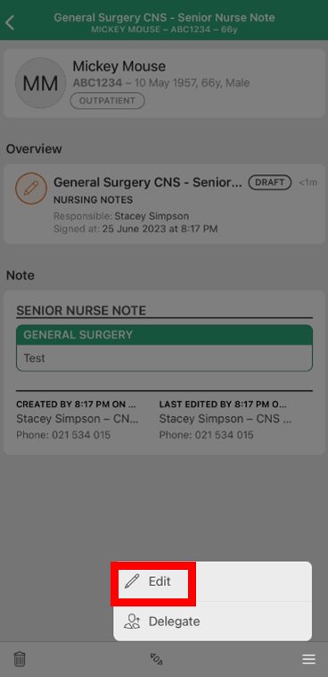- A draft note can also be delegated to another user, or another user can take ownership of the note if it remains in draft. Situations where this may occur are when another clinician takes over care of the patient (e.g. Medical Admission Note, Nursing Handover) or to complete the double signing process for students and supervising clinicians.