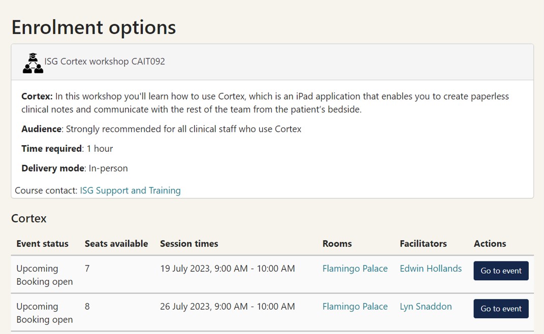 - Once logged in, Search Cortex and Select the Course (Cortex: CAIT092) to complete booking for training