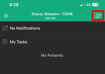 - Tap the "Manage my Patients” icon in the top right corner of the home screen.